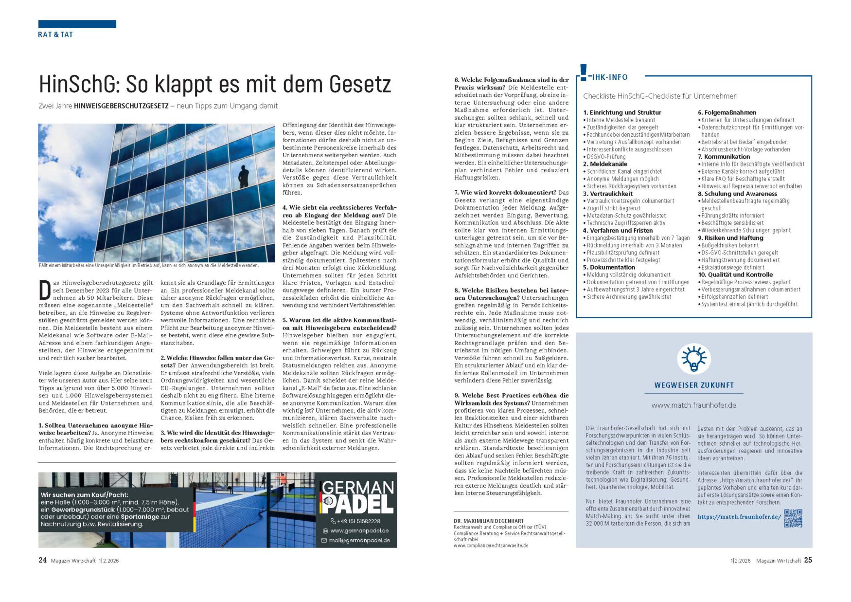 Im IHK Magazin Wirtschaft (Januar/Februar 2026) beleuchtet Dr. Maximilian Degenhart, Geschäftsführer der Compliance Rechtsanwälte, die zentralen Anforderungen des HinSchG aus anwaltlicher Sicht.